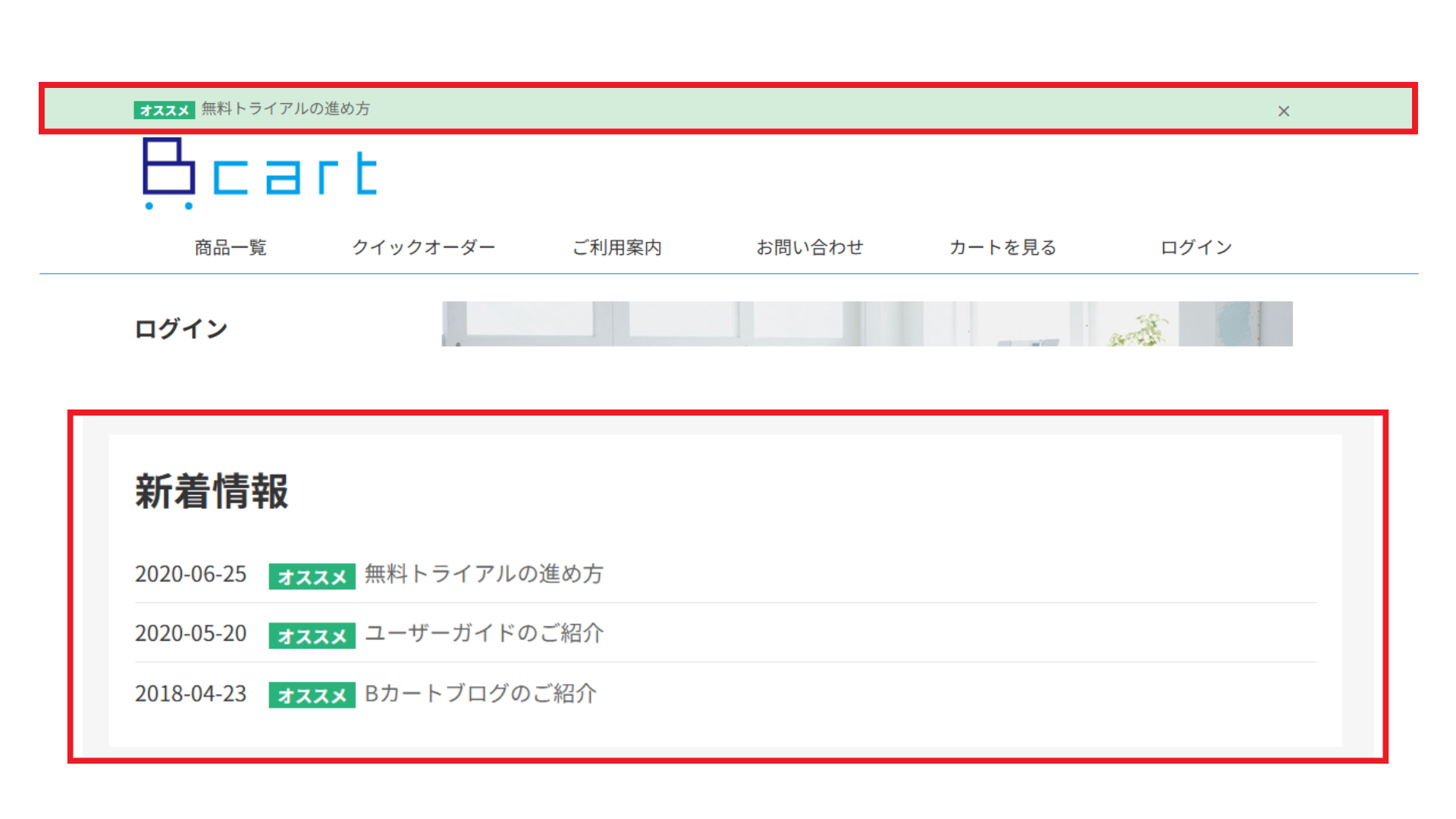 ■サイト上部バナー「無料トライアルの進め方」、サイト中部「新着情報」
