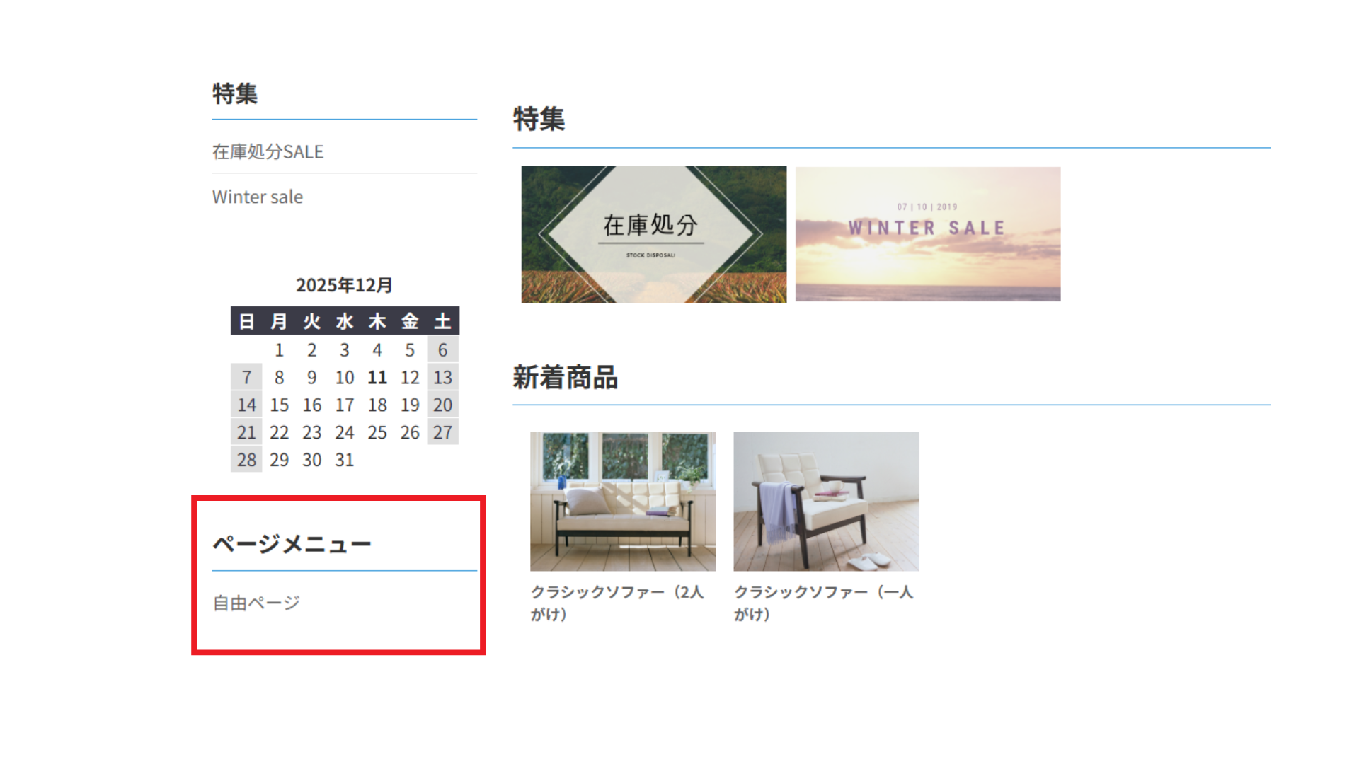 ■サイト中部、サイドメニュー「特集(在庫処分、winter sale)」