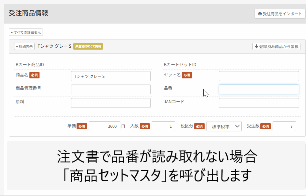 はい、可能です。読み取れなかった会員情報や配送先情報、商品情報は、登録済みのデータから選択して反映させることができます 。
