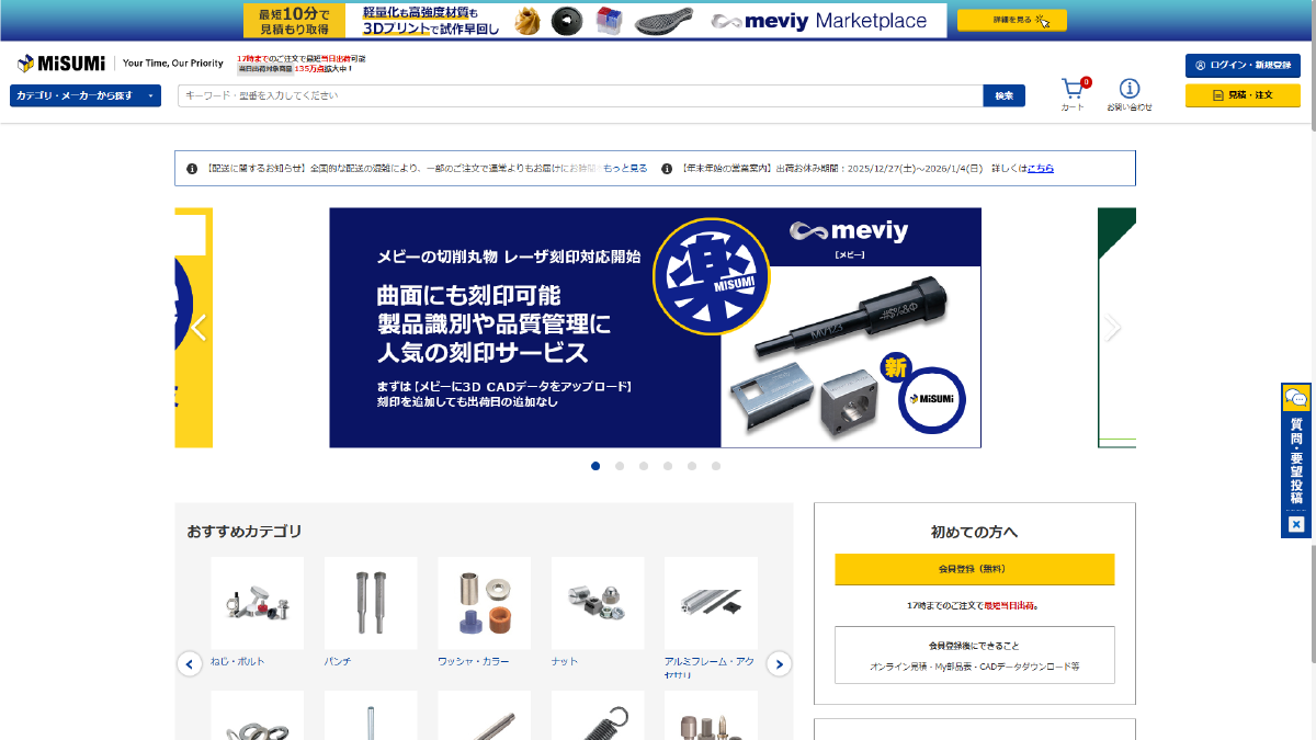 製造業の生産ラインで必要なFA(Factory Automation)や金型用の精密機械部品を「高品質・低コスト・短納期」で提供するBtoB通販企業としては、「MISUMI-VONA(ミスミ)」にも注目すべきでしょう。当初はベアリングや電子機器の販売目的として三住商事株式会社を設立し、物流・情報・製造設備を持たず、営業部や人事部すら持たない「持たざる経営」と呼ばれる経営手法で成果を上げてきました。ミスミグループの2025年3月期の連結決算は、売上高が約4,019億円(前期比9.3%増)となっており、流通事業(VONA)事業は同6.0%増の約1797億円でした。数百万点もの商品を取り扱っているBtoB通販では、サイト内でうまく商品にたどり着けるかどうかが支持を得るために必要なポイントの一つです。当サイトでは「瞬索くん」という検索や、工夫をこらした絞り込み検索が導入されています。