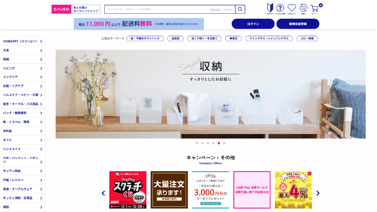 ダイソーは、1個から購入できる「ダイソーネットストア」のほかに、法人や大量購入者向けの「ダイソーオンラインショップ」も展開しています。ダイソーオンラインショップはケース単位のまとめ買いに特化したBtoB ECサイトで、請求書払い(NP掛け払い)などにも対応しており、文具・日用品・季節商品など、ダイソーの商品を効率よく調達することができます。