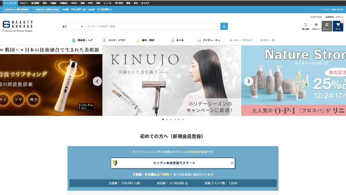 ビューティガレージは、美容室・理容室・エステサロンなどプロ向けに、美容機器や施術用消耗品、サロン家具、化粧品までをまとめて仕入れられる美容業界特化型のBtoB ECサイトです。300万点超の品揃えを業種・メニュー別に探しやすく整理しており、定期購入やポイント制度、セール企画などでサロンの仕入れ業務を効率化。ショールームや専門スタッフによる相談対応も用意されており、オンラインとリアルを組み合わせてサロン運営をトータルに支援しています。